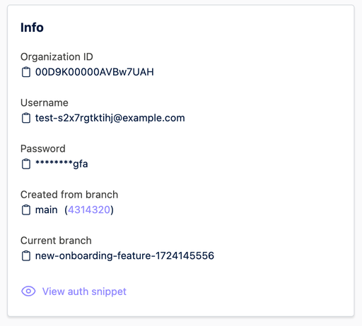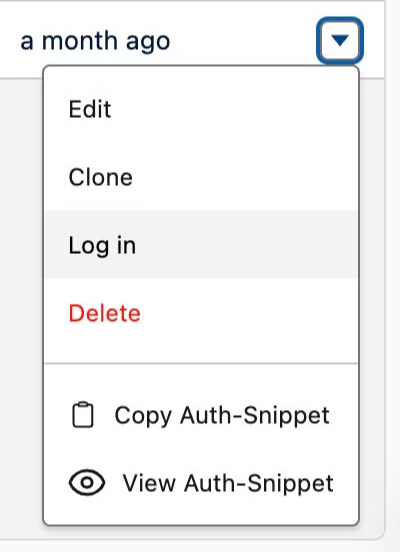 You can also view and copy the auth snippet via the options in the drop-down menu on the right-hand side of your Scratch Org’s list view row or from the Scratch Org detail view.