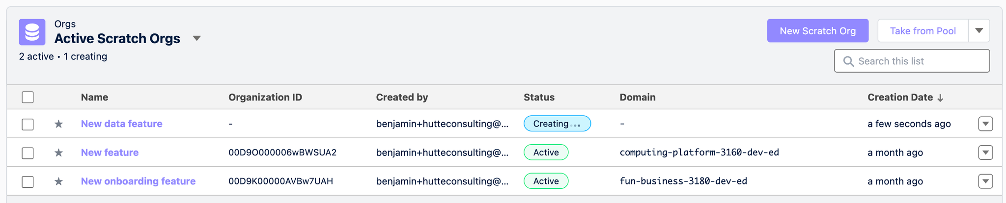 Once you’ve created or picked a Scratch Org from the Pool, you can access it or share it with your team members to begin working with it.